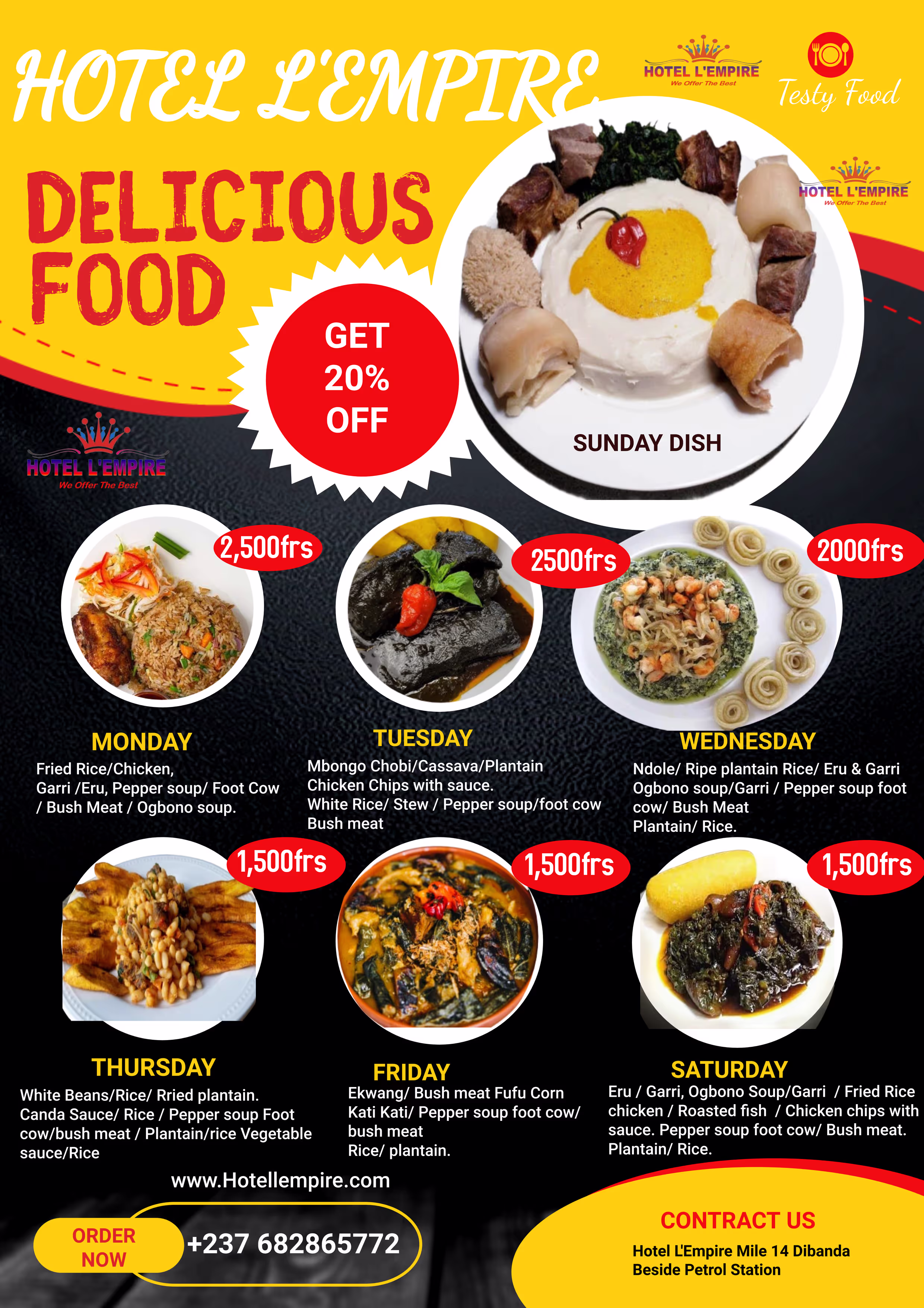 Our restaurant is currently offering a 50% discount on all meals, with special dishes starting from just 2,500 FCFA. Enjoy great food at an unbeatable price!