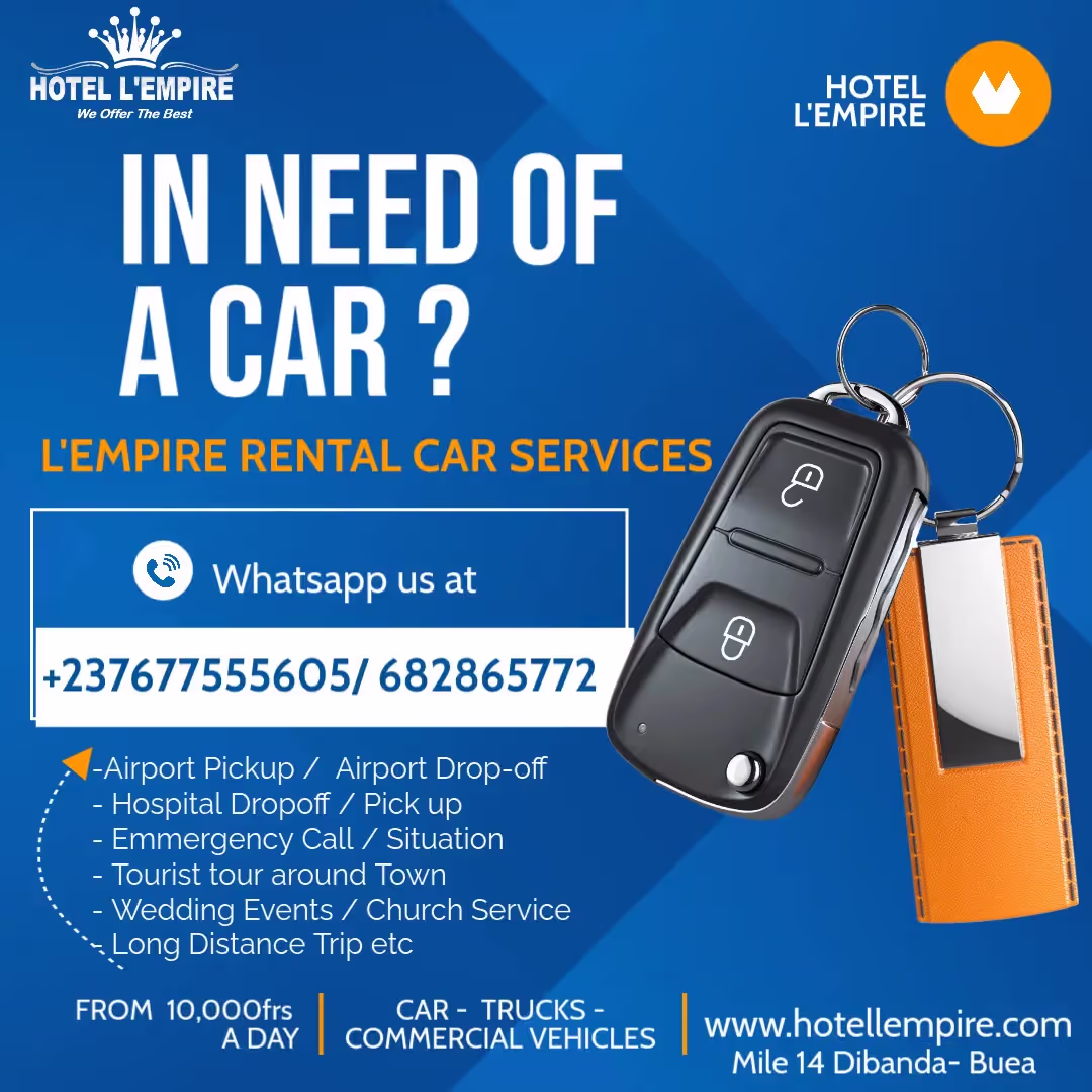 Hotel L’Empire offers a unique and reliable car rental service starting from just 10,000 FCFA. We provide a full range of transport solutions, including emergency car drop-off and pickup, airport transfers, tourist tours, wedding transportation, and long-distance trips across the country—all with professional drivers available.